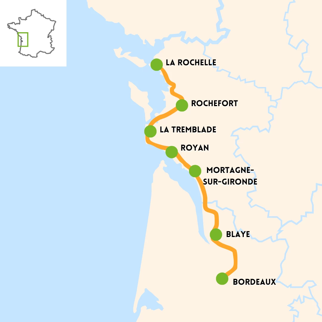 De La Rochelle à Bordeaux, partez pour une semaine à vélo le long de la Côte Atlantique et de l’Estuaire de la Gironde. L’itinéraire qui emprunte la Vélodyssée parcoure des paysages variés entres plages, forêts de pins, marais et villages de pêcheurs jusqu’à la station balnéaire de Royan. La seconde partie du voyage offre un changement de décor spectaculaire le long de la Gironde, le plus grand estuaire d’Europe. De falaises en côteaux, au milieu des marais et des grands domaines viticoles du Médoc, vous rejoindrez Bordeaux, capitale du vin.